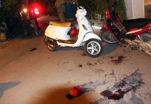 Vết máu cùng xe Vespa của nạn nhân tại hiện trường. Ảnh: An Nhơn